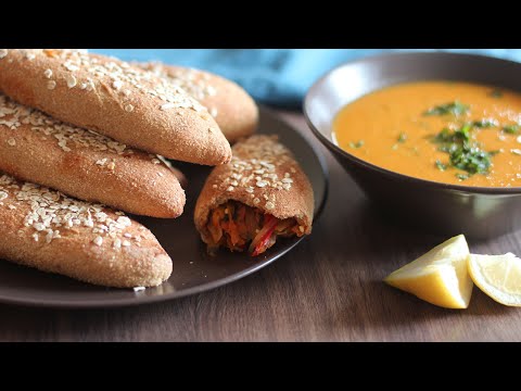 Pour varier vos mets pour lftour (le repas du soir en mois de ramadan) en essayant de manger bon et diététique , je vous propose deux recettes délicieuses et nutritives ! Une soupe aux lentilles et des petits pains à la farine complète, farcis aux légumes.